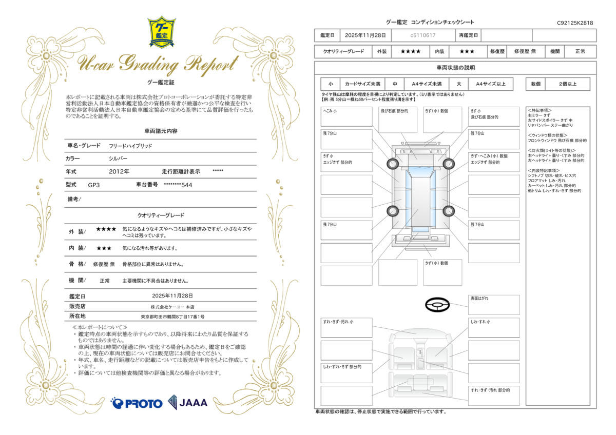 ケーユーでは修復歴の有無を全車に表示。公的機関「(財)日本自動車査定協会」の基準を採用。日本オートオークション協議会「走行距離管理システム」で距離に不正が無いかもチェック済みです。 15