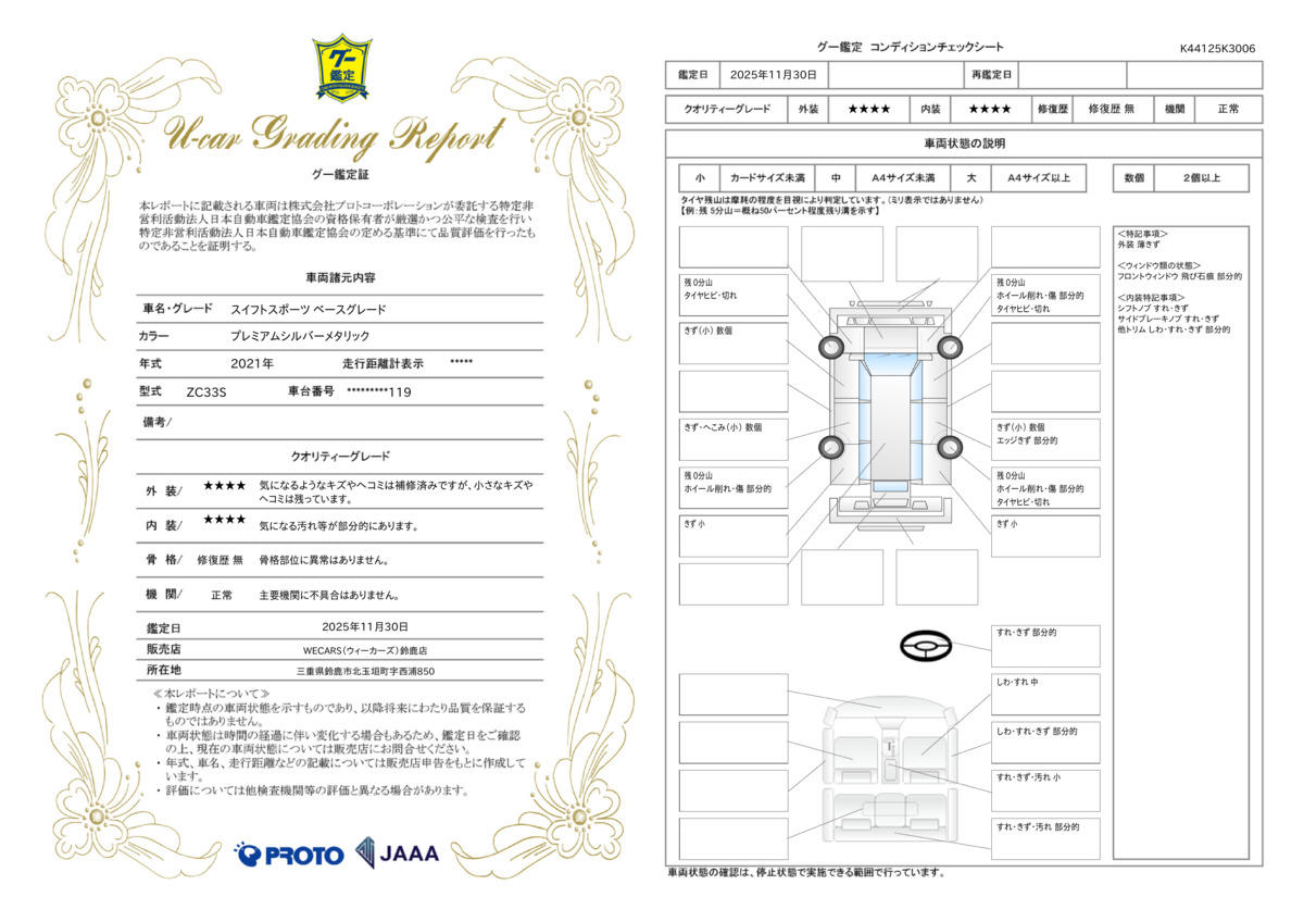 [保証付]:1ヶ月・1000km ※いずれか早い時期が保証適用の条件となります。 納車後1ヶ月・1000km以内は36機構・343項目を保証いたします。詳しくは販売店までお問い合わせ下さい。 |