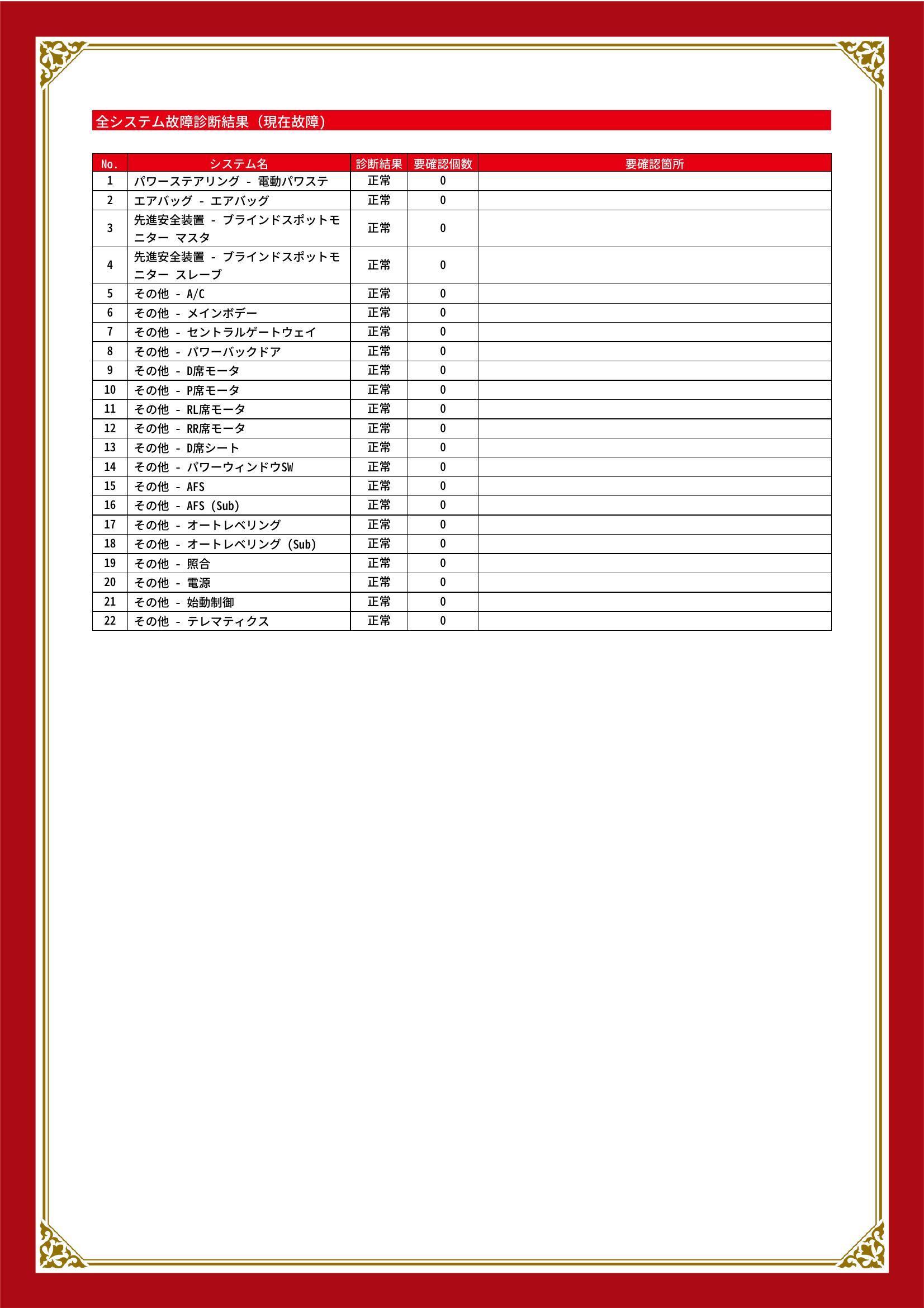 | 保証項目 | 3ヶ月・3000km以内ならエンジン、トランスミッション、ハイブリッド、ステアリング、ブレーキの各機構における主要項目を無償修理(または交換)いたします。 |