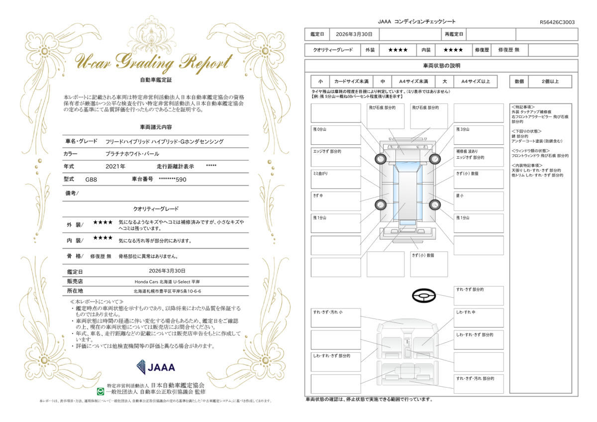 このお車は第三者機関(JAAA)が鑑定を行い、その結果を鑑定証として発行しております。