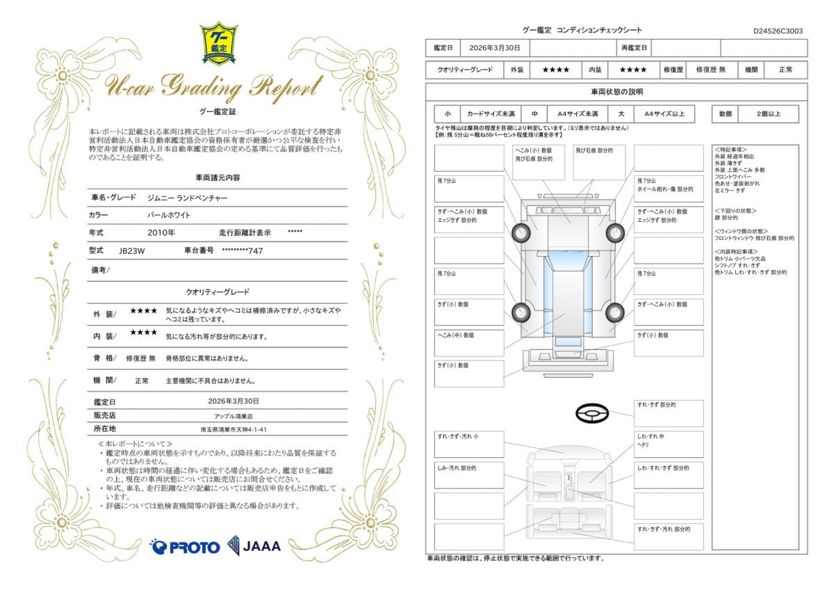 このお車は第三者機関(JAAA)が鑑定を行い、その結果を鑑定証として発行しております。