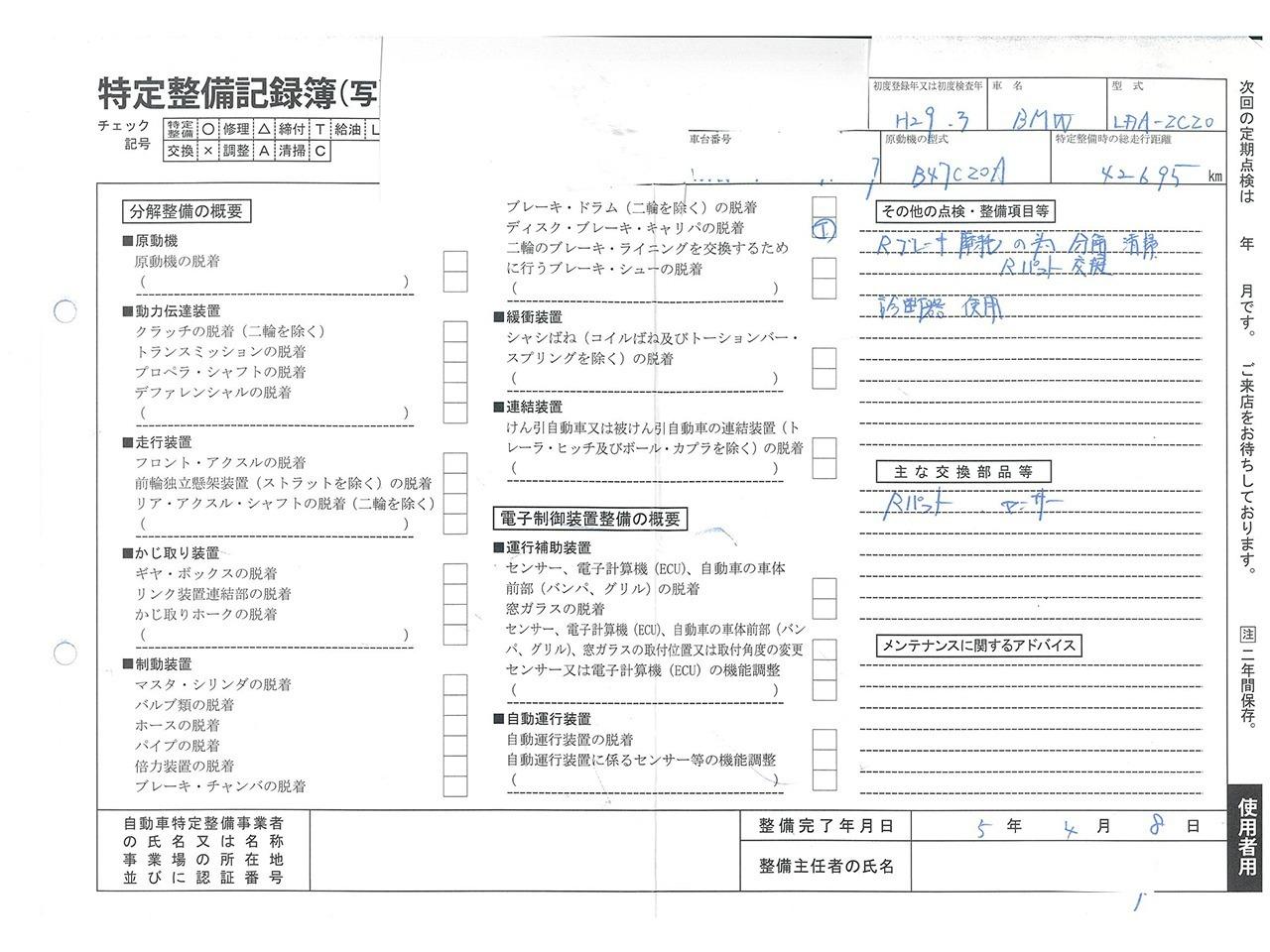 | 当社はBMWクオリティパートナー認定店です。ご納車前に認証工場にて点検致します。点検整備記録簿も発行致します。 |
