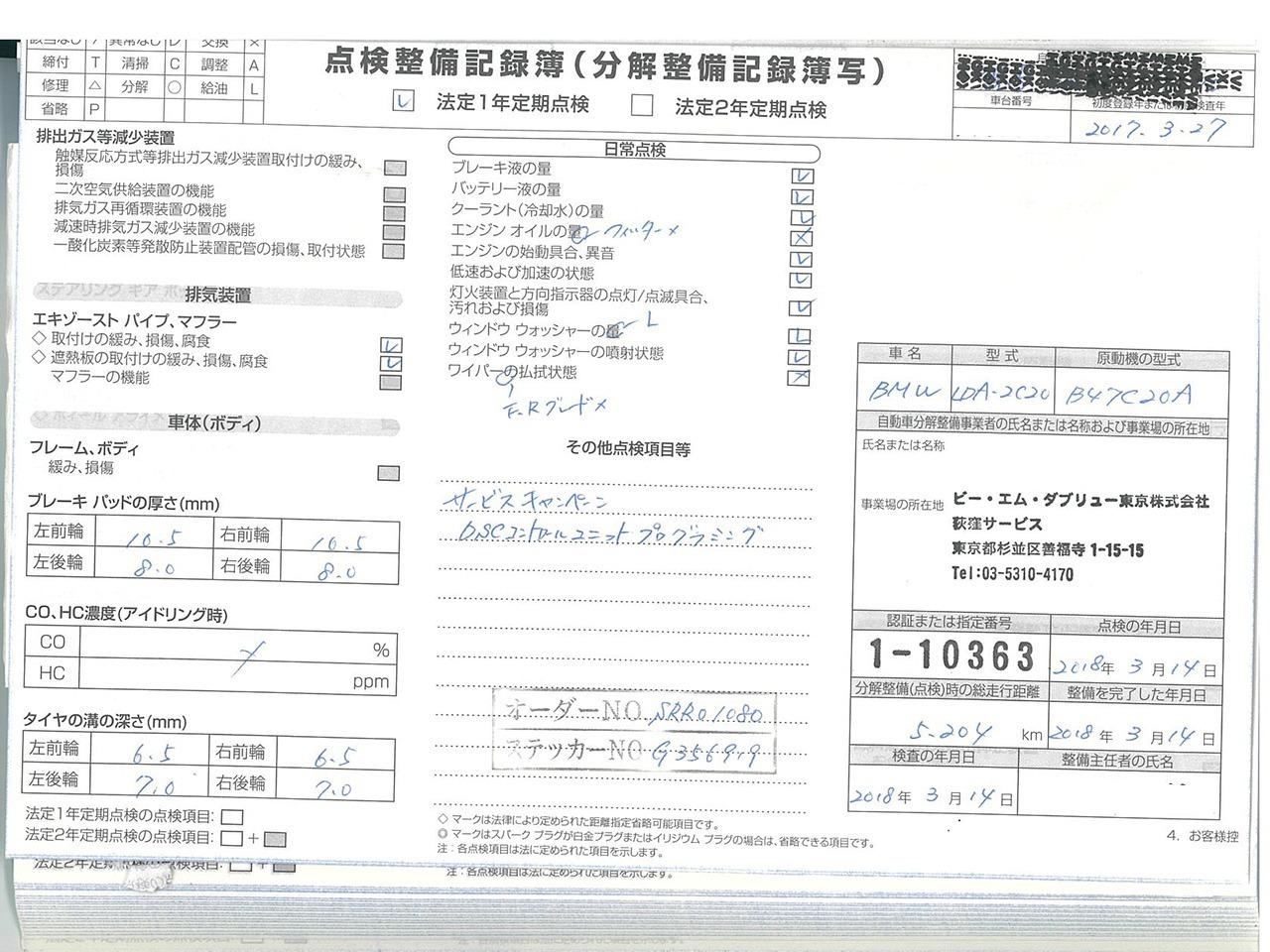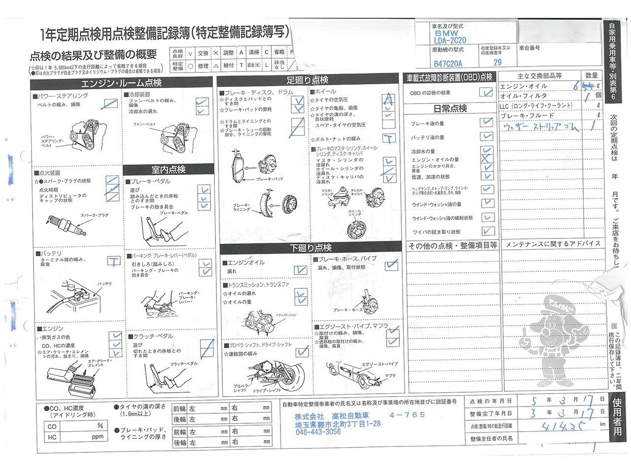 整備付 ご契約後からご納車までに認証工場にてBMW専門店ならではの110項目点検を実施致します。点検費用は支払総額に含まれております。点検整備記録簿を発行致します。 |