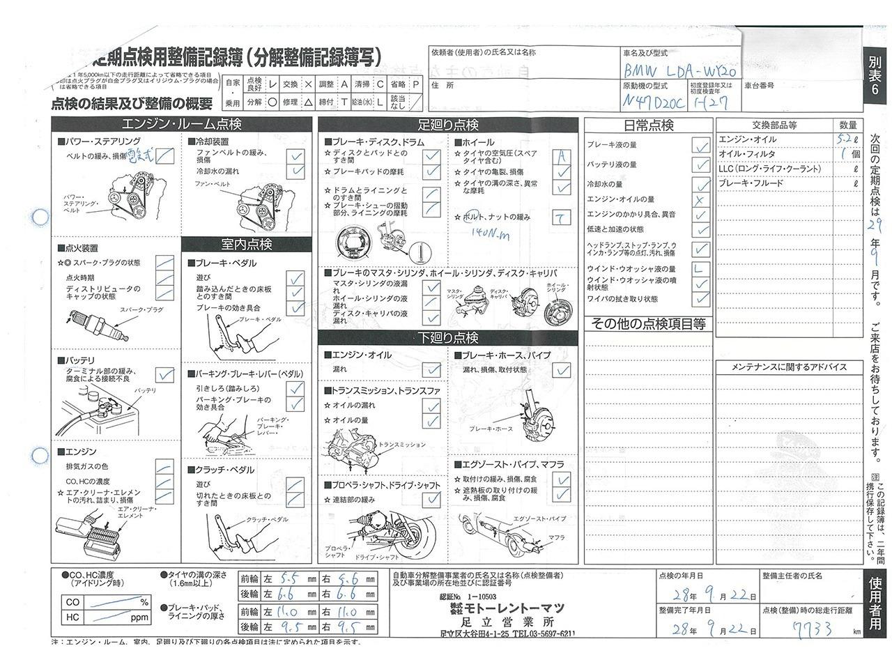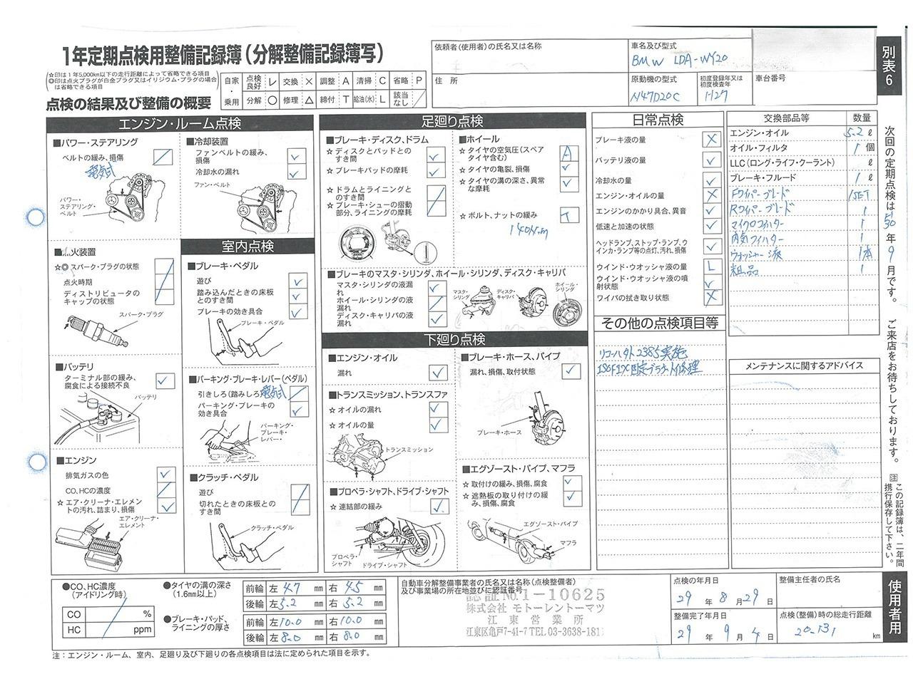 | 当社はBMWクオリティパートナー認定店です。ご納車前に認証工場にて点検致します。点検整備記録簿も発行致します。 |