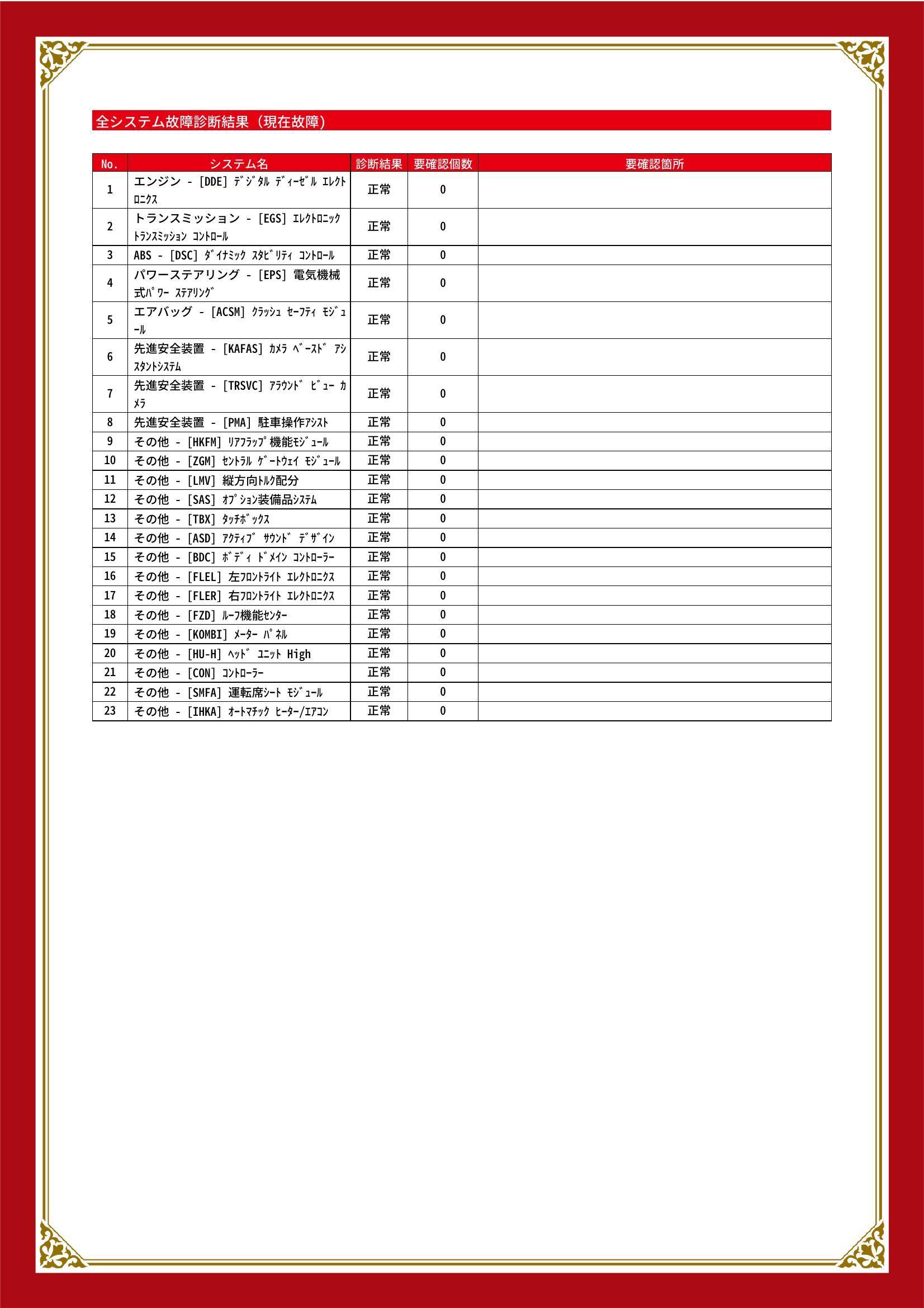 | 保証項目 | 1ヶ月以内なら走行距離無制限にてエンジン、トランスミッション、ハイブリッド、ステアリング、ブレーキの各機構における主要項目を無償修理(または交換)いたします。 |