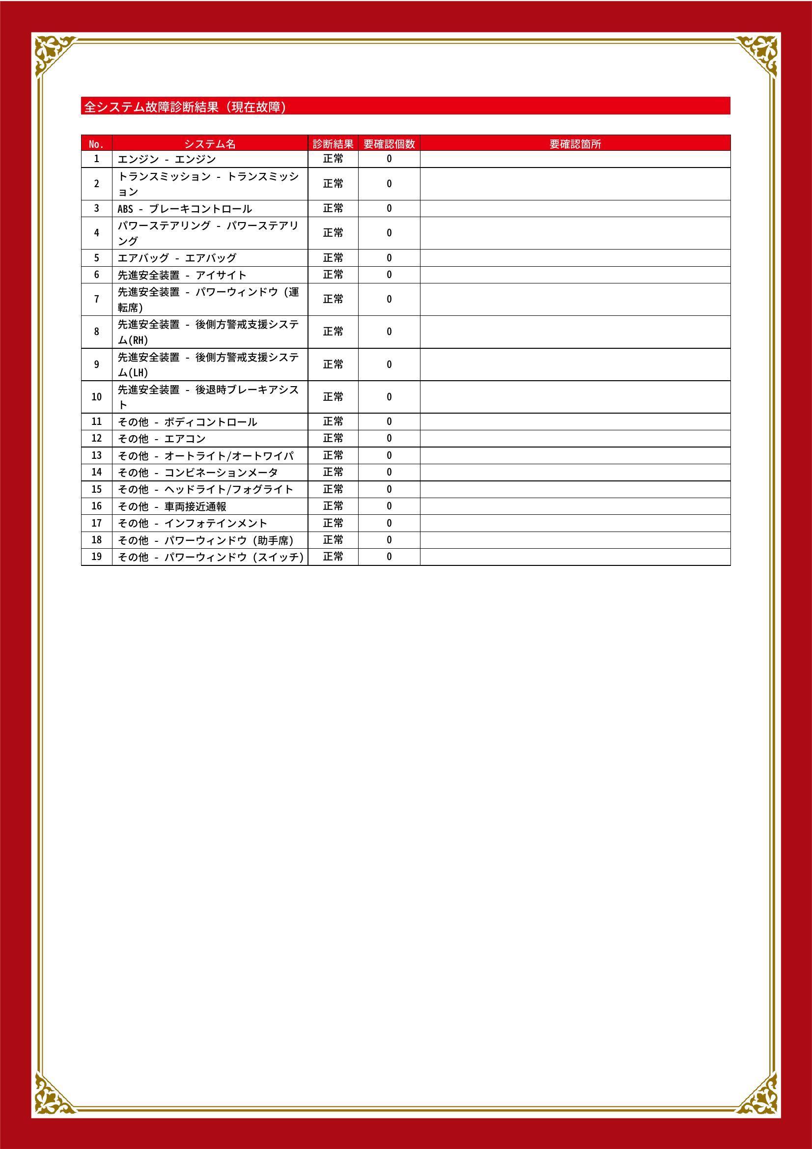 | 保証項目 | 3ヶ月・3000km以内ならエンジン、トランスミッション、ハイブリッド、ステアリング、ブレーキの各機構における主要項目を無償修理(または交換)いたします。 |