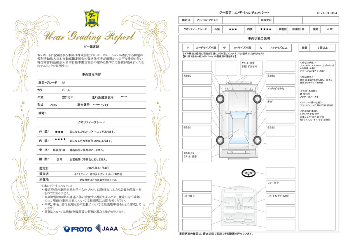 弊社では、全車『修復歴なし』のお車のみ取り扱っております。専任バイヤーによる厳選した仕入れの後、入庫後の車両チェックを行い、ネクステージが認定した高品質な中古車をご提供しております。 14
