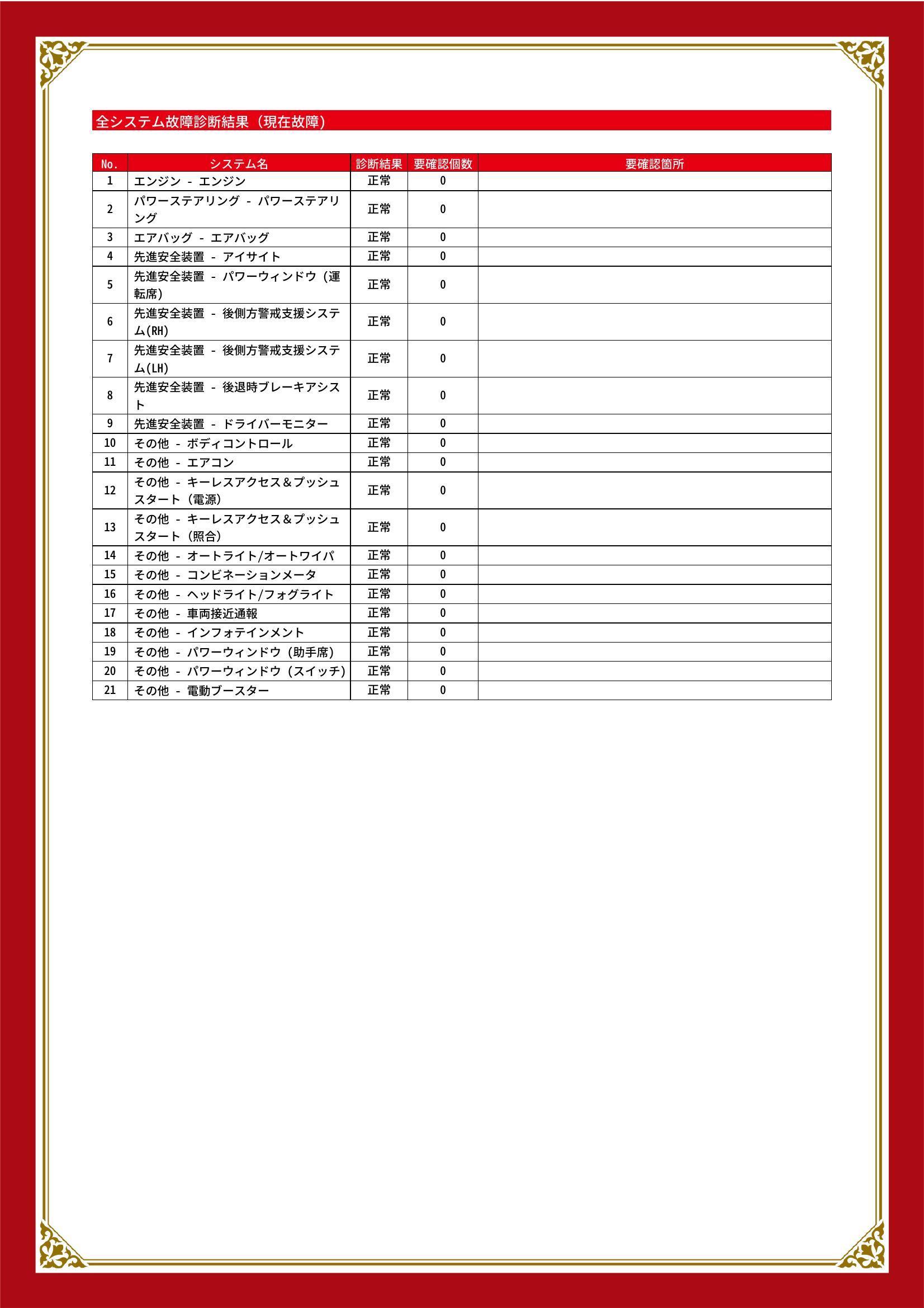 | 保証項目 | 3ヶ月・3000km以内ならエンジン、トランスミッション、ハイブリッド、ステアリング、ブレーキの各機構における主要項目を無償修理(または交換)いたします。 |