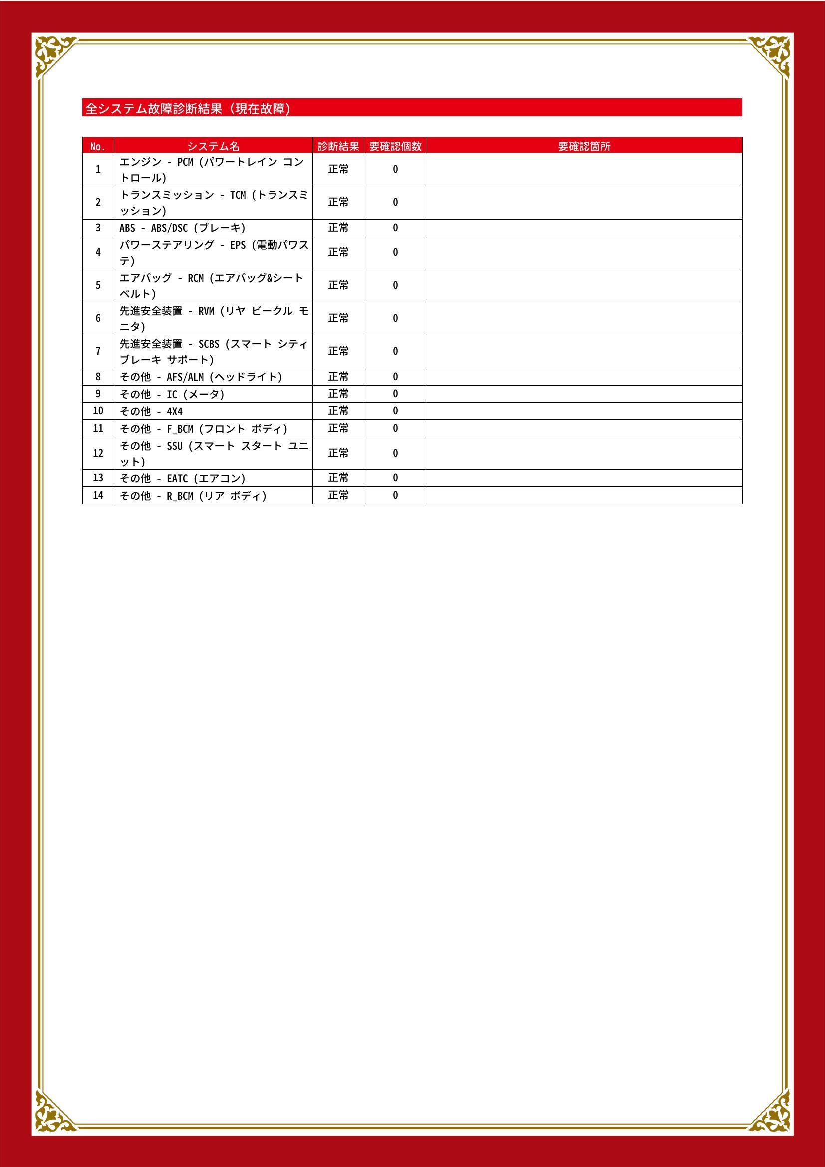 | 保証項目 | エンジン、ミッション、パワートレイン、ディファレンシャル、ステアリング、サスペンション、ブレーキ、経年・消耗部品(一部)、その他。無償修理(又は交換)にて対応致します。詳細はスタッフより説明致します。 |