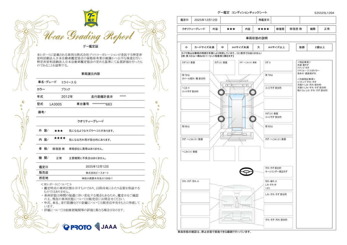 | 保証項目 | 警告チェックランプ点灯・スピードメーターが動かない・ハンドルがスムーズに操作できない・ギアが変速しない・ドアミラー・F・Rバンパーの破損・ガラスやヘッドライトのひび割れ エンジンや足廻りりから異音等。 |