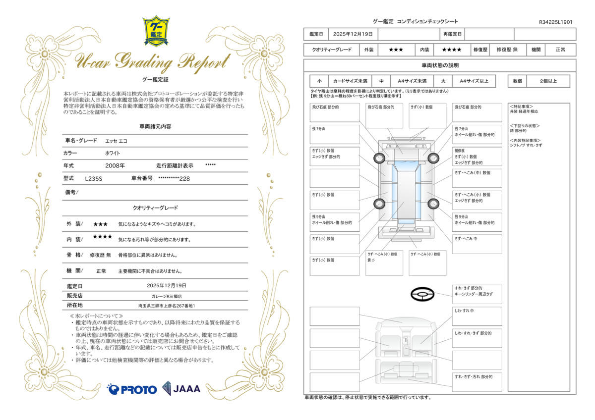 中古車の状態は、専門家でなければなかなか分かりにくいものです。外観は綺麗に見えても内装や隠れた部分、修復歴の有無などほとんど分かりません。お客様に安心してお車を選んで頂く為に、当社の展示車は全て第三者機関の日本自動車鑑定協会の鑑定師が中古車を鑑定。プロが一台一台チェックします。