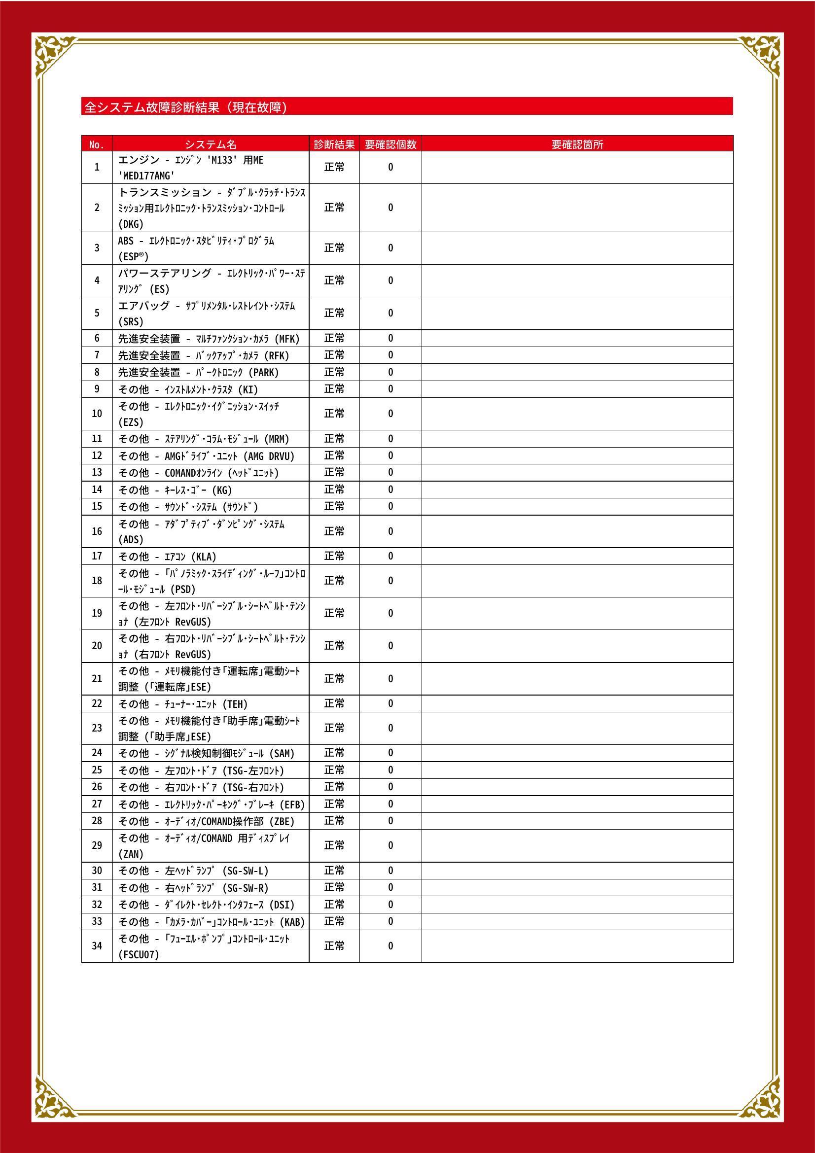 [保証付]:3ヶ月・3000km ※いずれか早い時期が保証適用の条件となります。 納車日より3ヶ月又は3000kmに達するまで無料で保証が受けられます。遠方のお客様はお近くのディーラー、又は提携工場でのご対応となります。メンテナンスも含めて納車後も幅広くお客様をサポート致します。 |