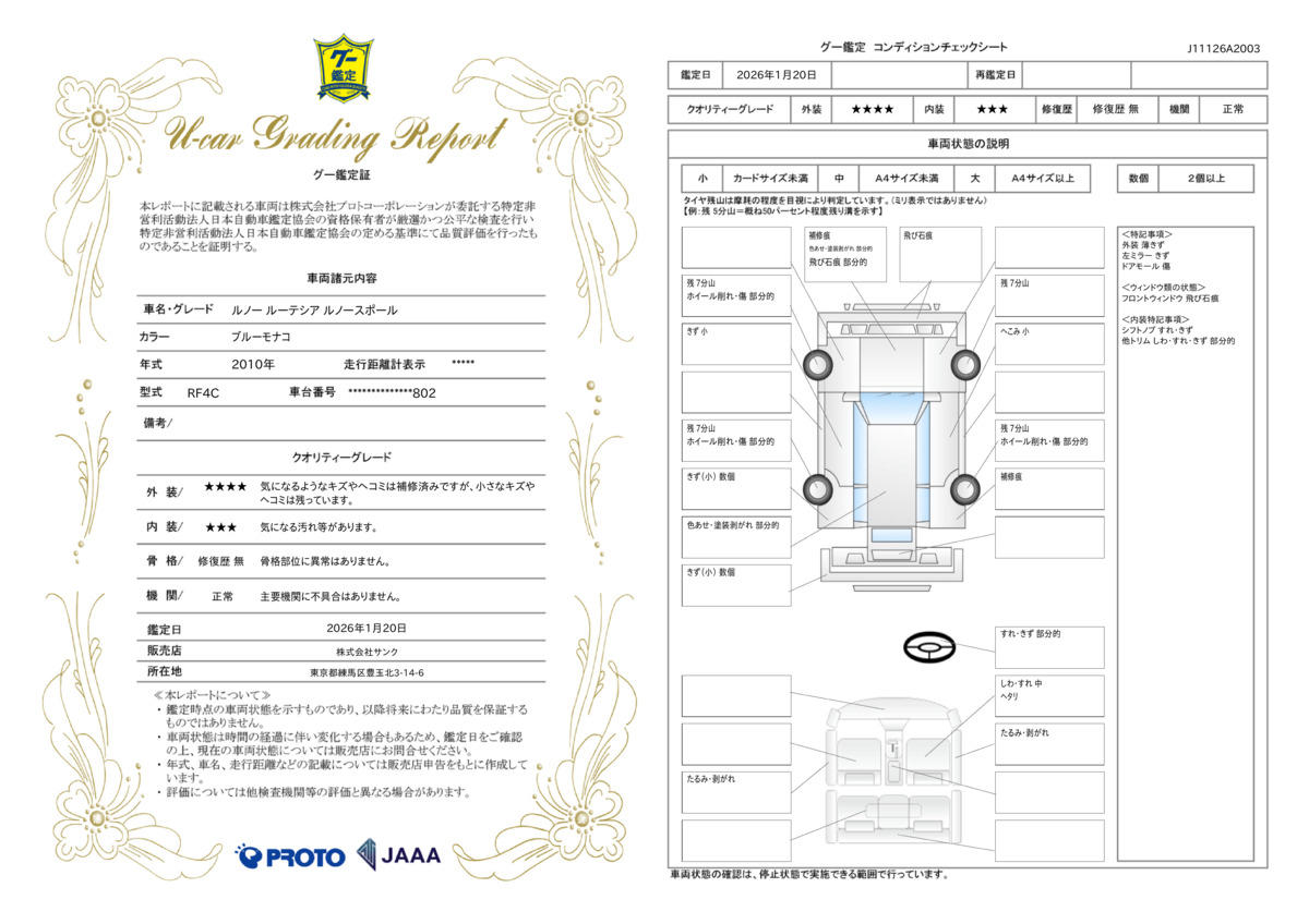 [保証付]:3ヶ月・3000km ※いずれか早い時期が保証適用の条件となります。 納車整備を施した車両は納車時から90日又は3000kmの工賃保証が付きます。保証期間内における保証修理は工賃を無料とさせて頂きます。納車整備時に交換した部品に関しても半年間の保証が付きます。 |
