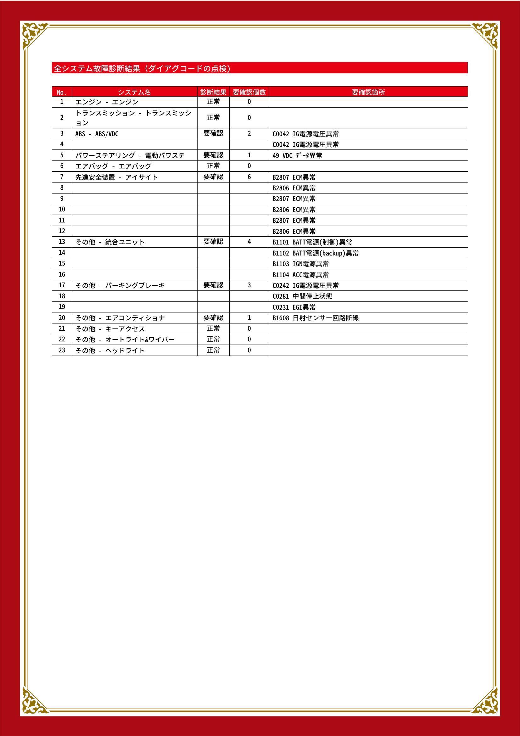 | 保証項目 | 3ヶ月・3000km以内ならエンジン、トランスミッション、ハイブリッド、ステアリング、ブレーキの各機構における主要項目を無償修理(または交換)いたします。 |