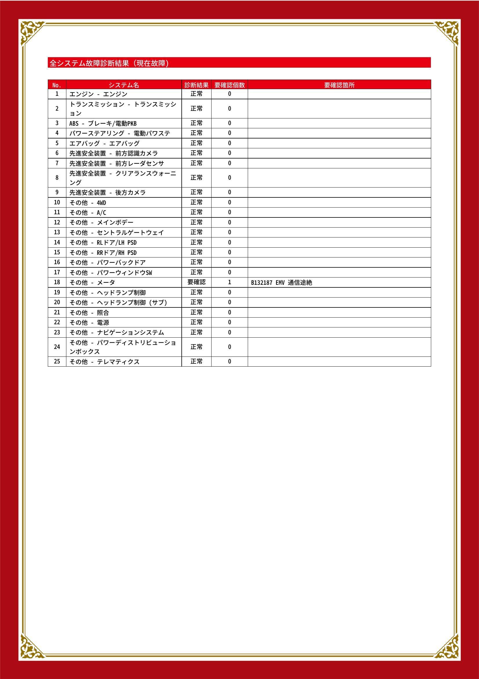 | 保証項目 | 3ヶ月・3000km以内ならエンジン、トランスミッション、ハイブリッド、ステアリング、ブレーキの各機構における主要項目を無償修理(または交換)いたします。 |