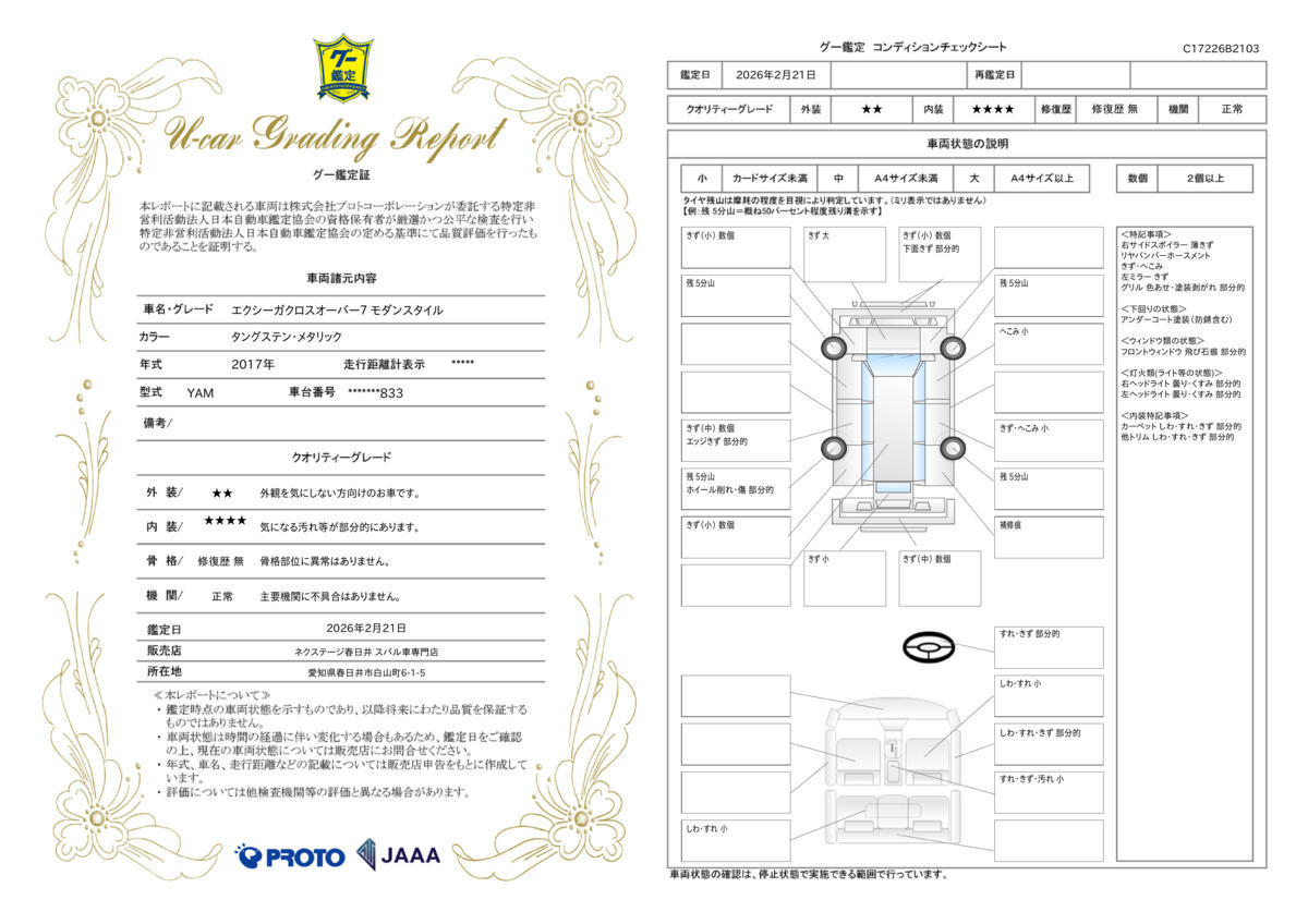 | 保証項目 | 3ヶ月・3000km以内ならエンジン、トランスミッション、ハイブリッド、ステアリング、ブレーキの各機構における主要項目を無償修理(または交換)いたします。 |
