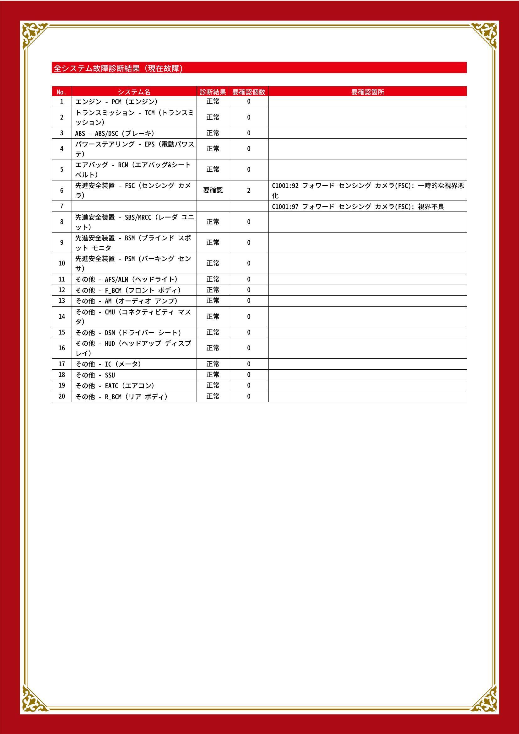 | 保証項目 | その他、スタンダード・プラチナ保証をご用意。【スタンダード・プラチナ保証】では対象項目が業界最高水準の400部位以上!消耗品以外は保証にてご対応出来ます。詳細は店舗へお問い合わせください! |
