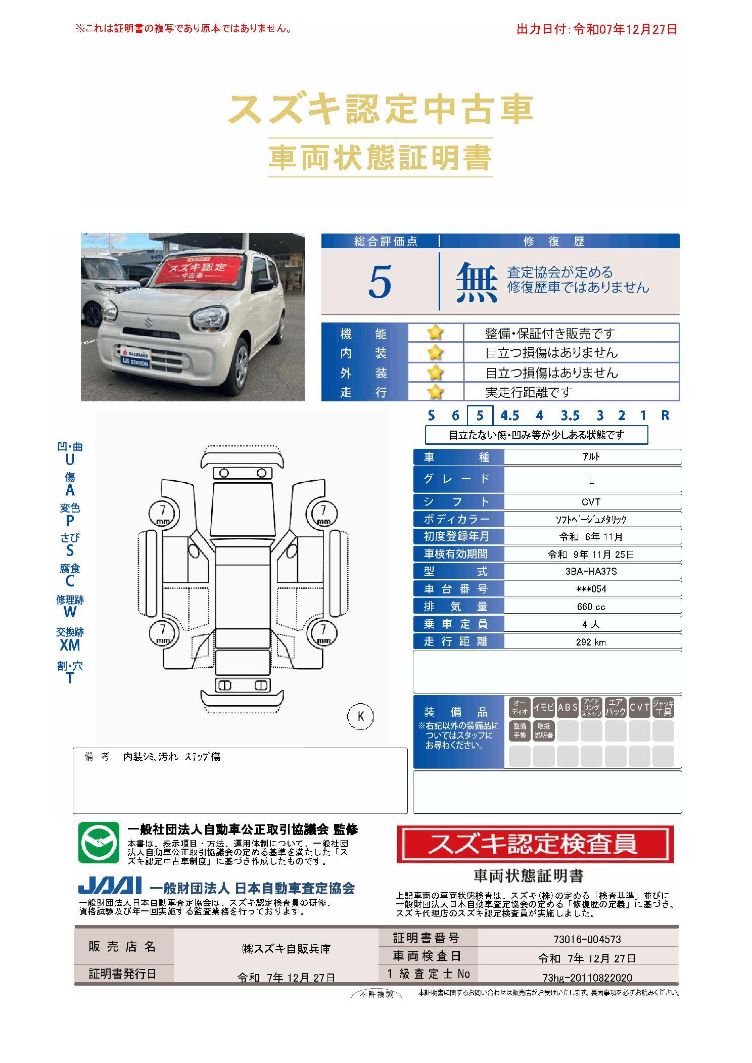 | 保証について | [保証付]:2027(令和9)年11月まで・60000km ※いずれか早い時期が保証適用の条件となります。 |