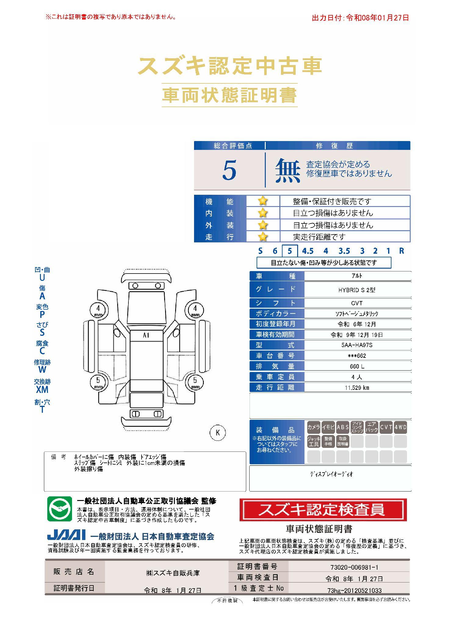 | 保証について | [保証付]:2027(令和9)年12月まで・60000km ※いずれか早い時期が保証適用の条件となります。 |