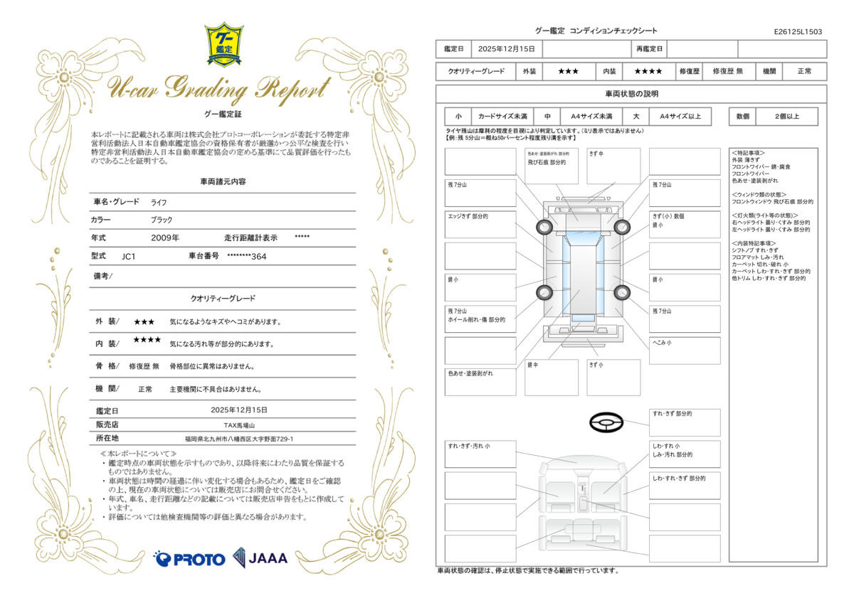 Goo鑑定とは在庫車輌を第三者機関である日本自動車鑑定協会(JAAA)が鑑定し、内装&外装の評価点を5点満点でGoo−net上に開示する事です。そうする事によってお車の情報を明確にし、お客様に信頼をお届け致しております。修復暦の不正表示やメーター改ざん等は一切御座いません。