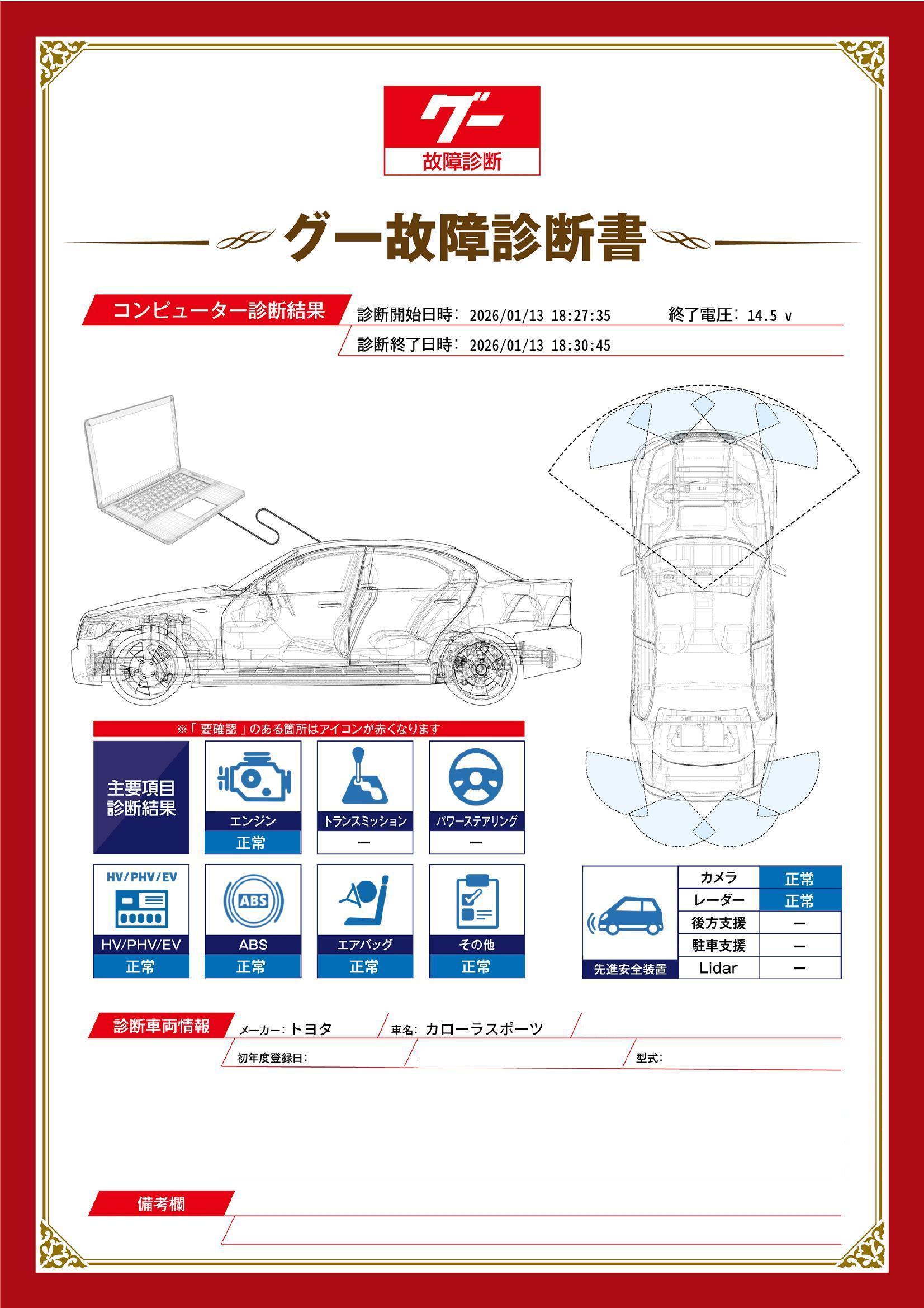 | 保証項目 | 3ヶ月・3000km以内ならエンジン、トランスミッション、ハイブリッド、ステアリング、ブレーキの各機構における主要項目を無償修理(または交換)いたします。 |