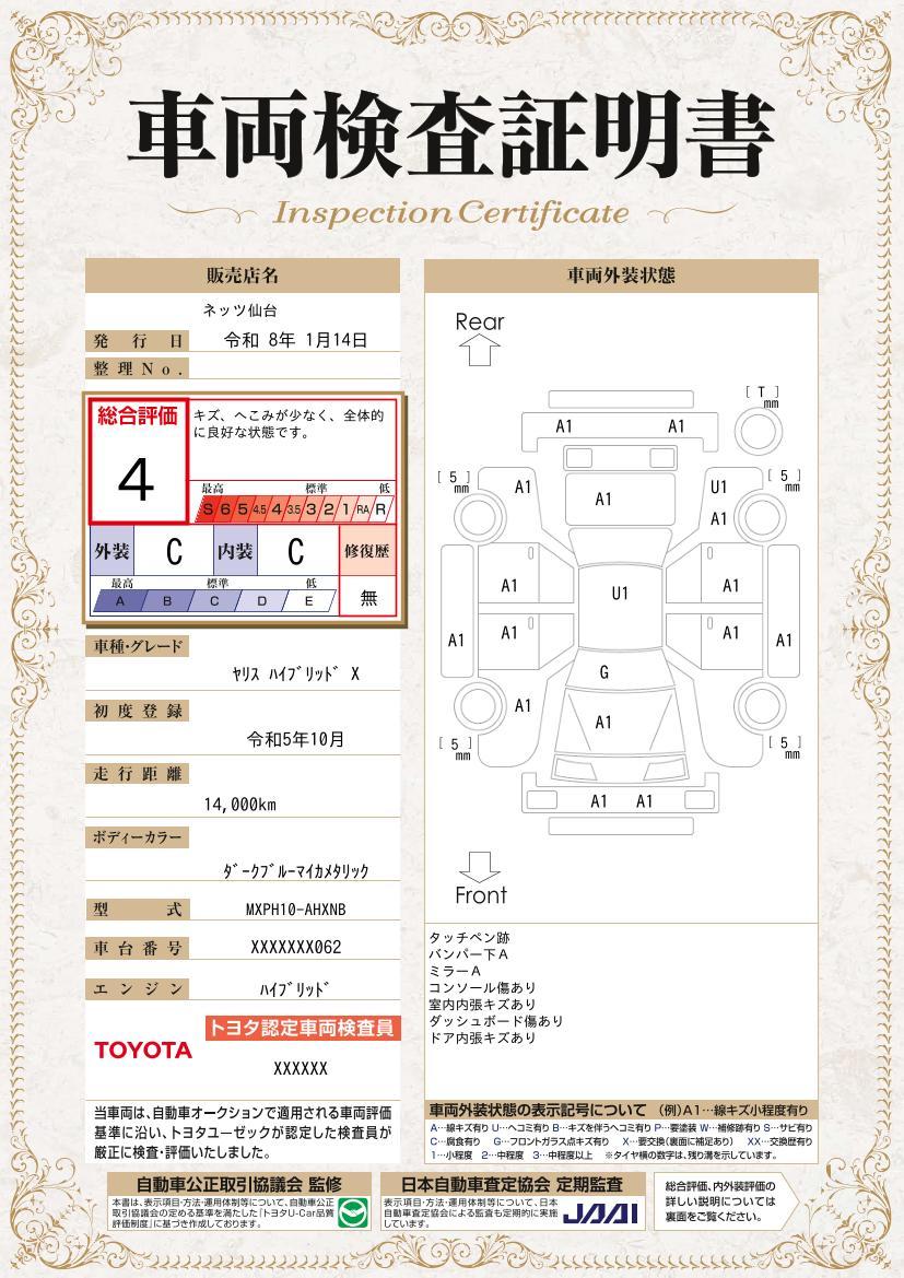 [保証付]:12ヶ月・走行無制限 ロングラン保証1年<走行距離無制限> +ハイブリッド保証<保証期間は初度登録年月から10年目まで、もしくは3年間のいずれか長い方。但し走行距離20万キロまで> |