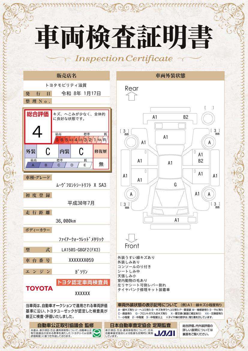 車のキズや修復歴などを一目でわかりやすく表示しております。安心して車選びを楽しんでいただくための証明書です。